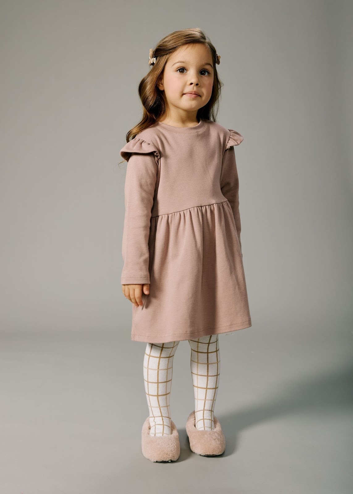 Это платье — пример нарядной одежды, которая остается по-детски настоящей. Никаких жёстких застежек и неудобных воланов. Только мягкий хлопковый трикотаж, свободный крой, нежные воланы на плечах и превосходный оттенок молочного шоколада.