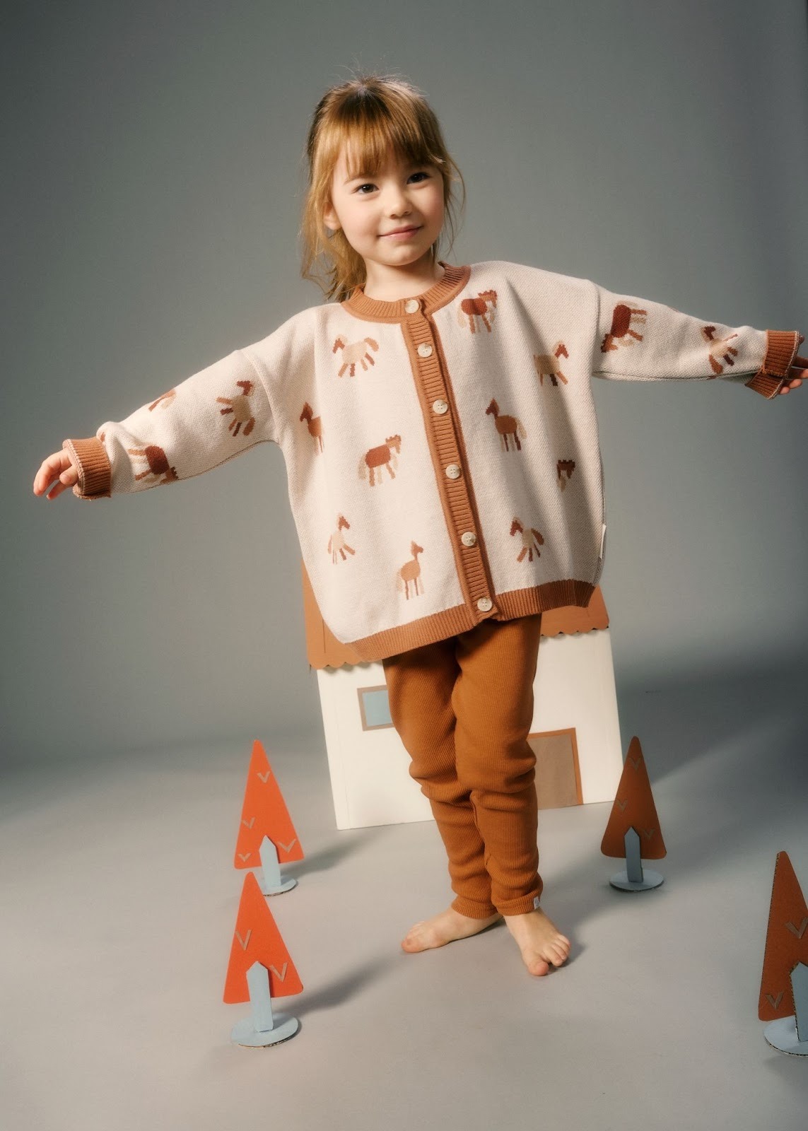 Самая уютная история для начала каникул — мягкий кардиган с лошадками, символом наступающего года. Он создает атмосферу тепла и спокойствия, а легинсы образно «продолжают» уют, они эластичные, теплые, сидят по фигуре и не сковывают движения.
