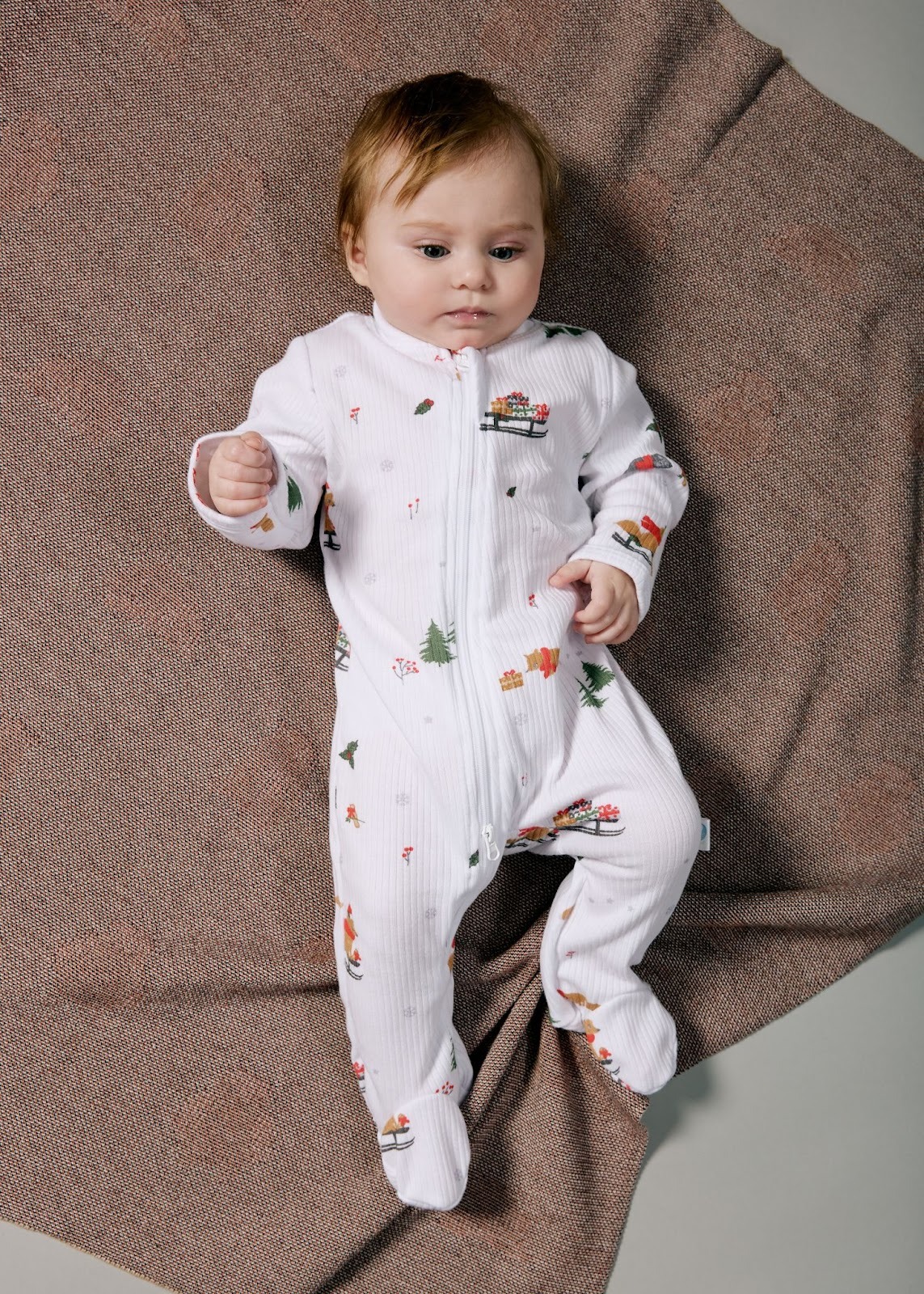 Мягкая рибана, молния наискосок и новогодний принт с елками, подарками и санками. Слип не просто удобный, он визуально создает ощущение праздника и делает фотографии уютнее.