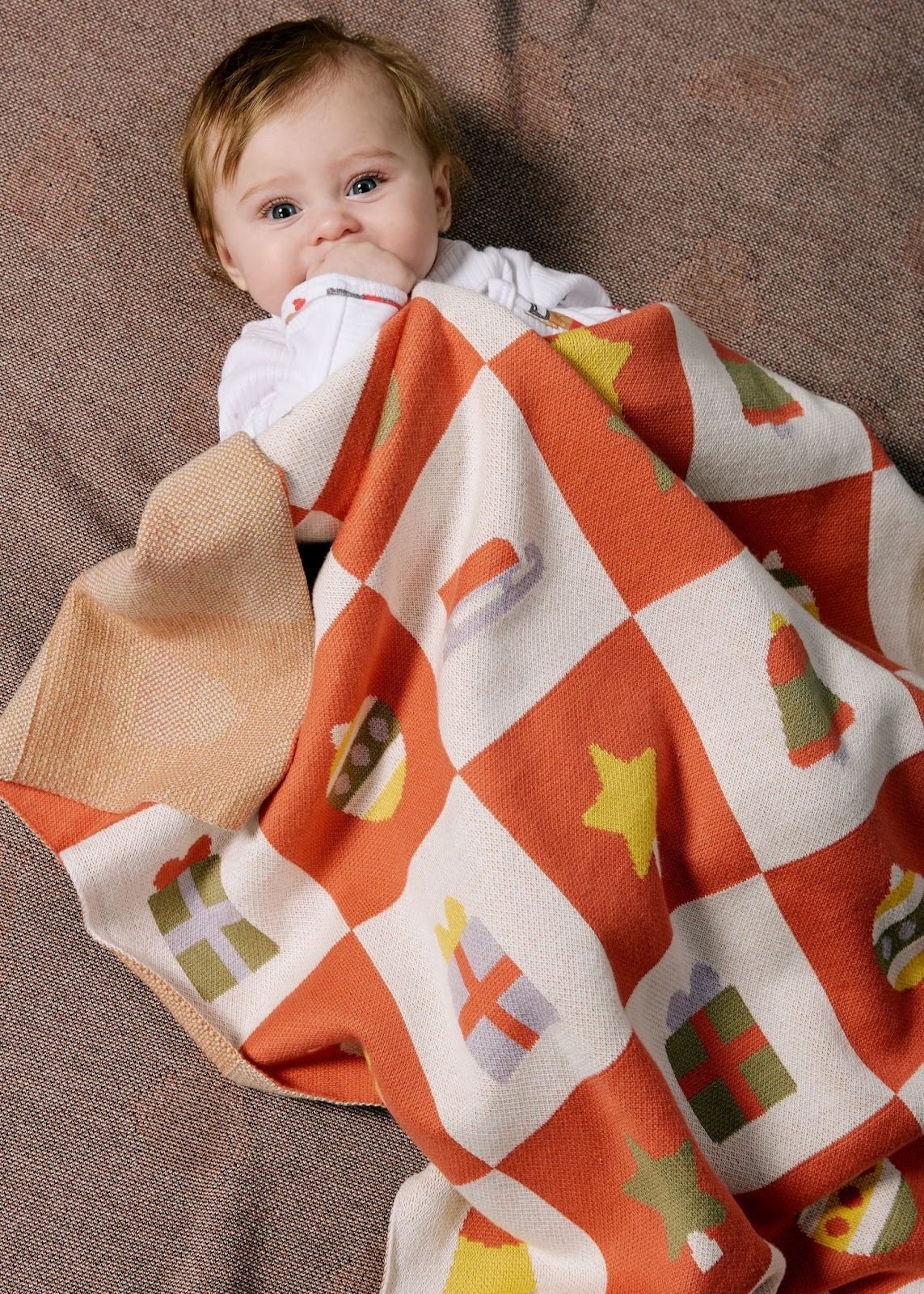 Плед с принтом в виде ёлочных игрушек работает сразу в нескольких ролях.