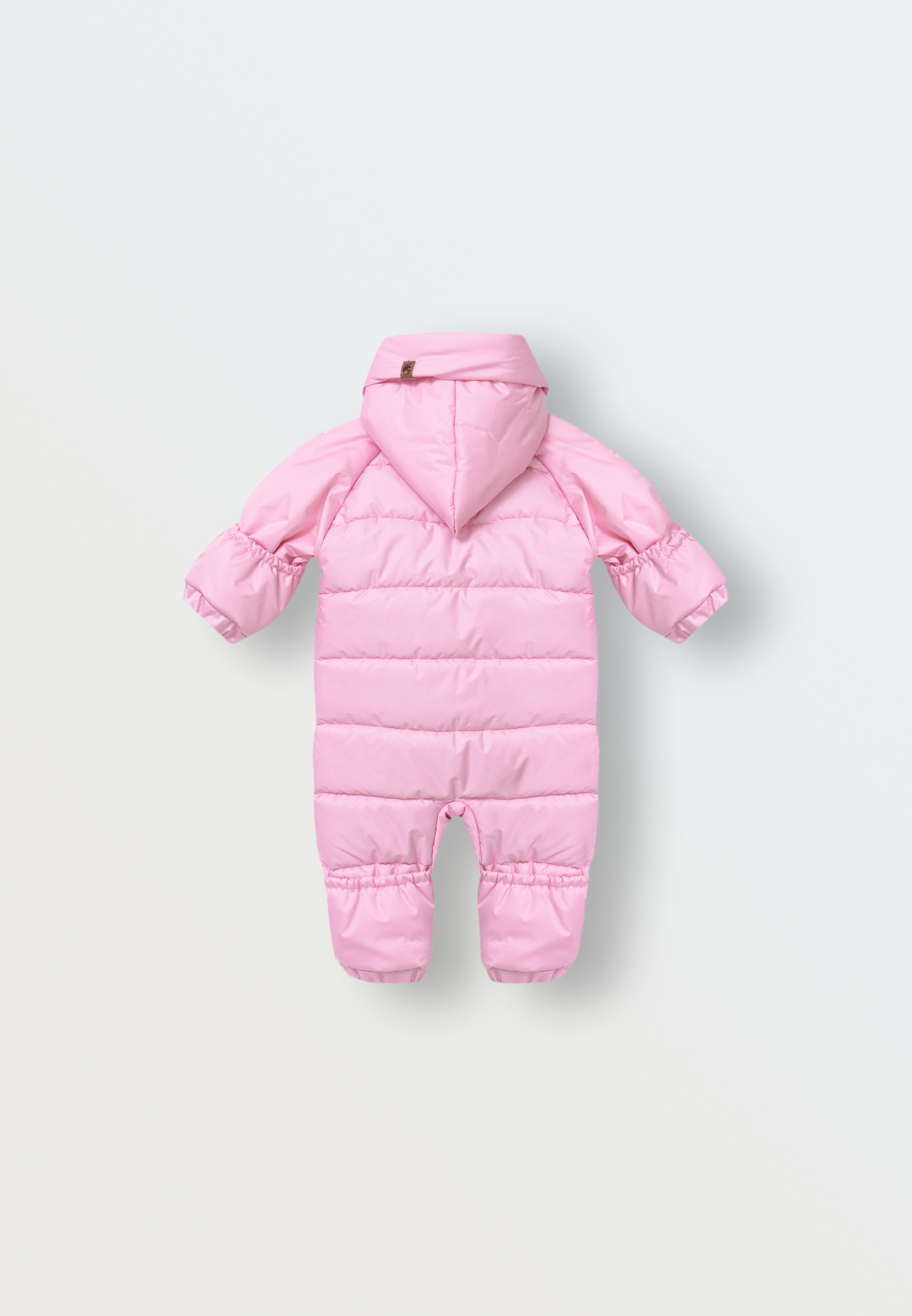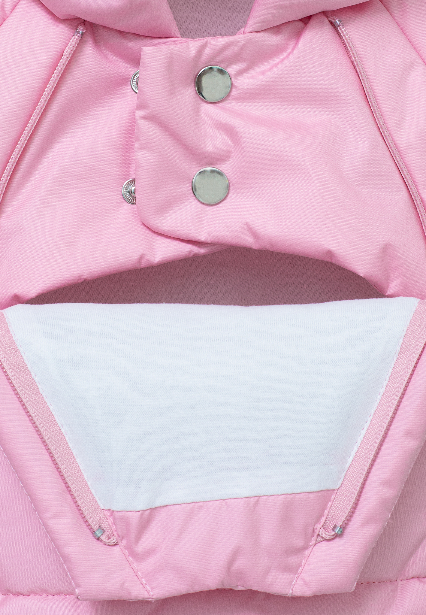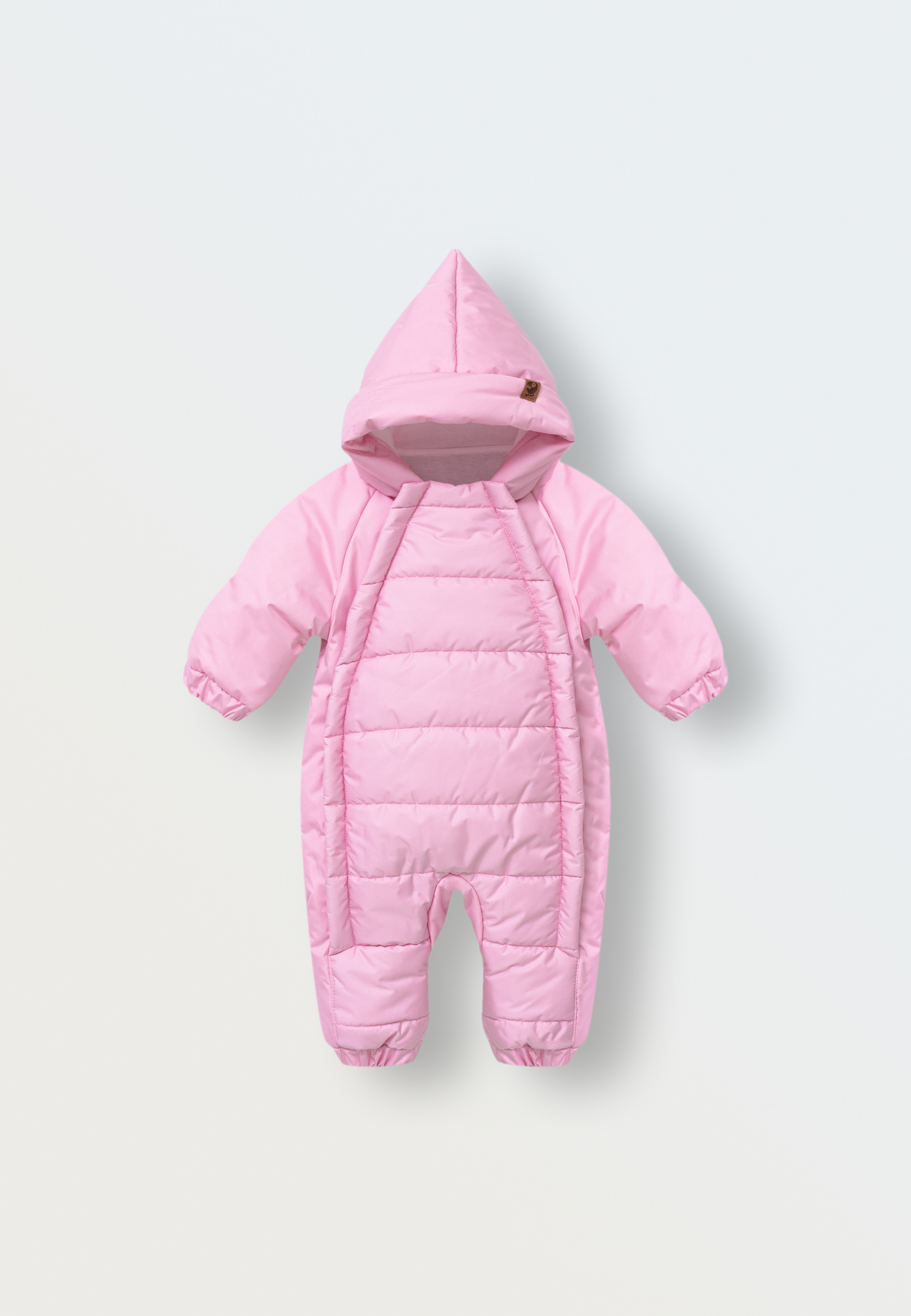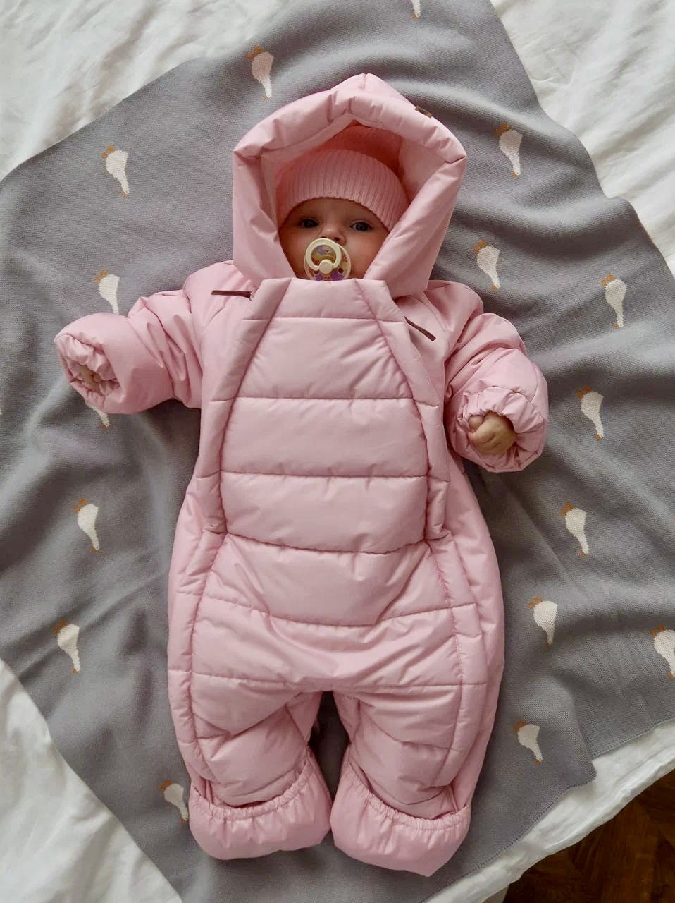 Легко надевать даже на новорождённых благодаря двум молниям. Пока малыш маленький, манжеты удобно закрыть, что избавит от необходимости надевать носочки и рукавички. Далее можно добавить пинетки. Глубокий капюшон имеет утяжки, а ветрозащита на груди регулируется кнопками.