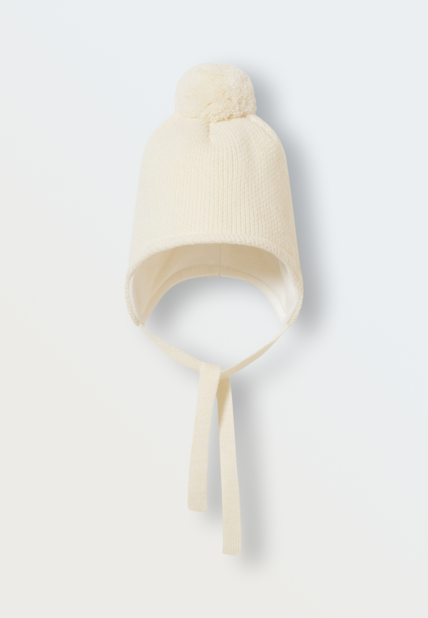 В шапочке предусмотрена мембранная ветрозащита ушей, она выполнена в анатомичной форме, плотно прилегающей к голове и надёжно закрывающей ушки от ветра. Завязки фиксируют её под подбородком, а мягкий помпон добавляет акцент.