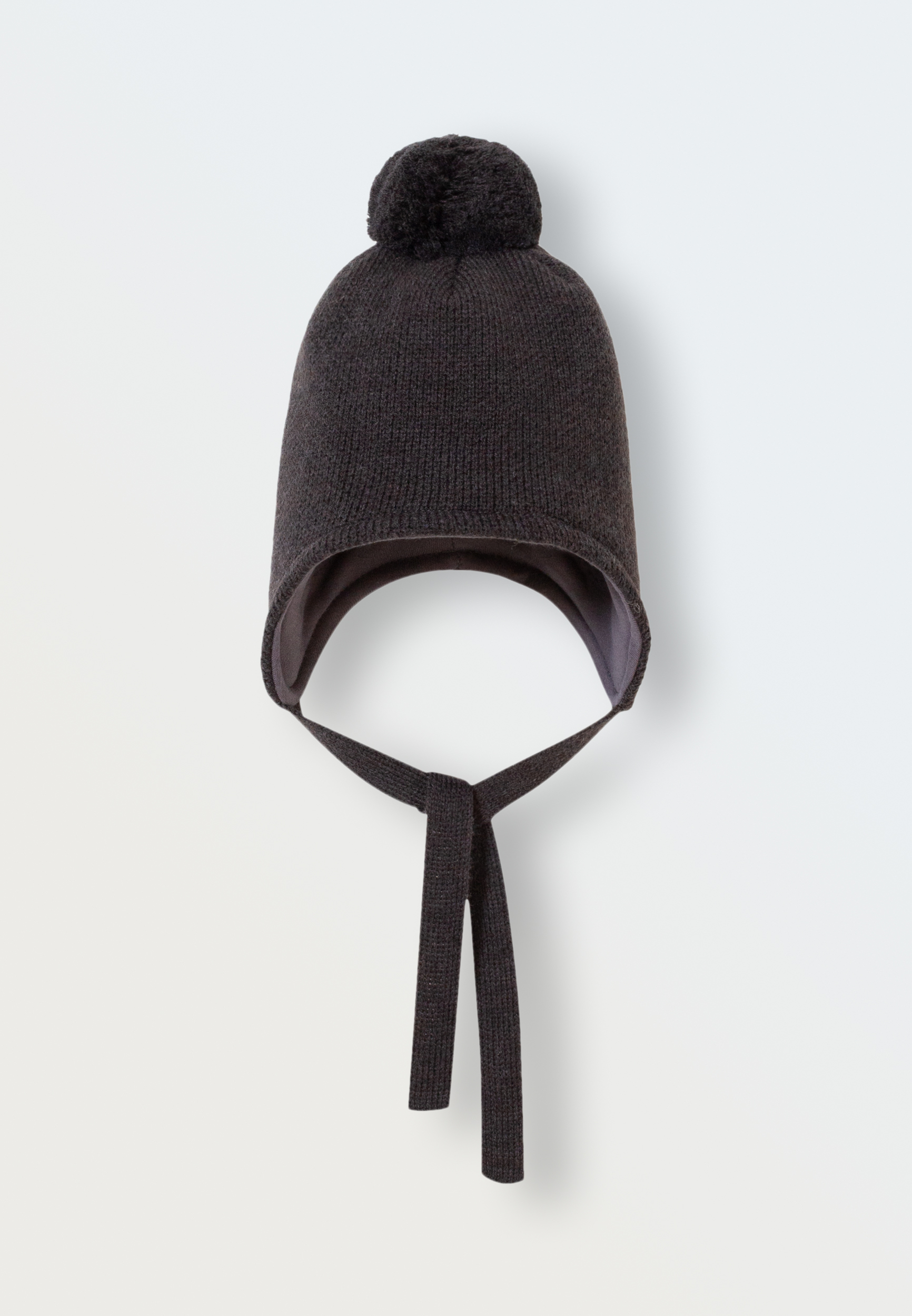 Шапка выполнена в анатомичной форме, плотно прилегающей к голове и надёжно закрывающей ушки от ветра. Завязки фиксируют её под подбородком, а мягкий помпон добавляет акцент.