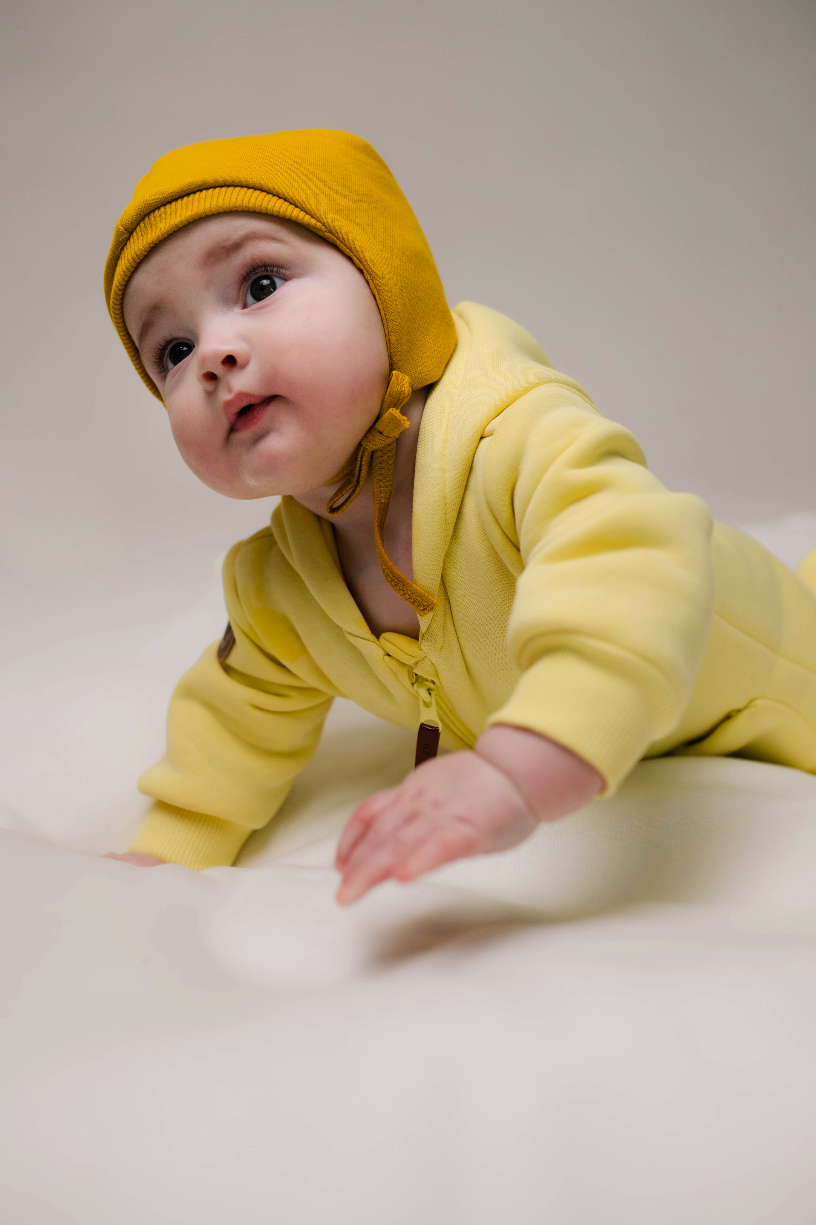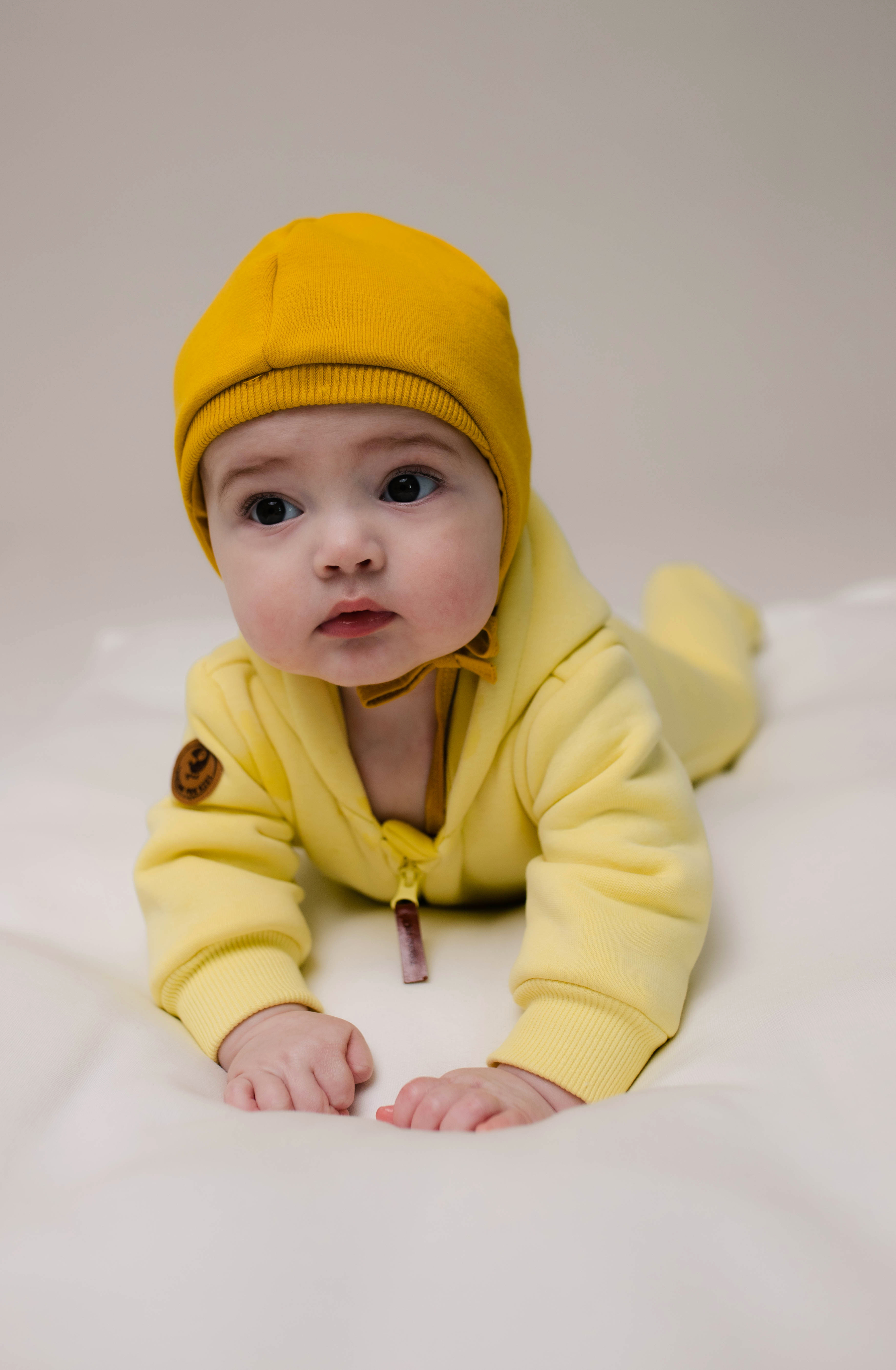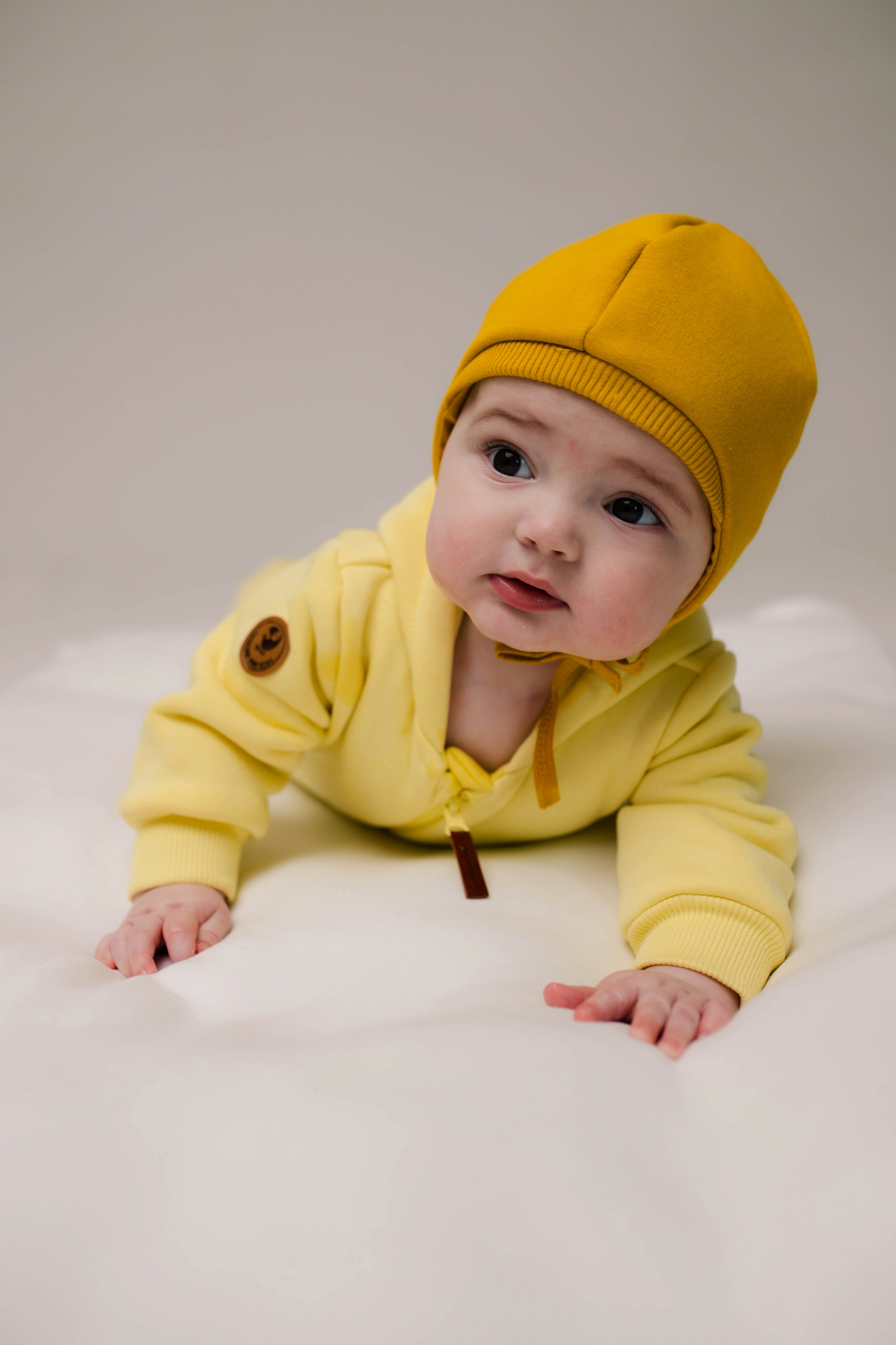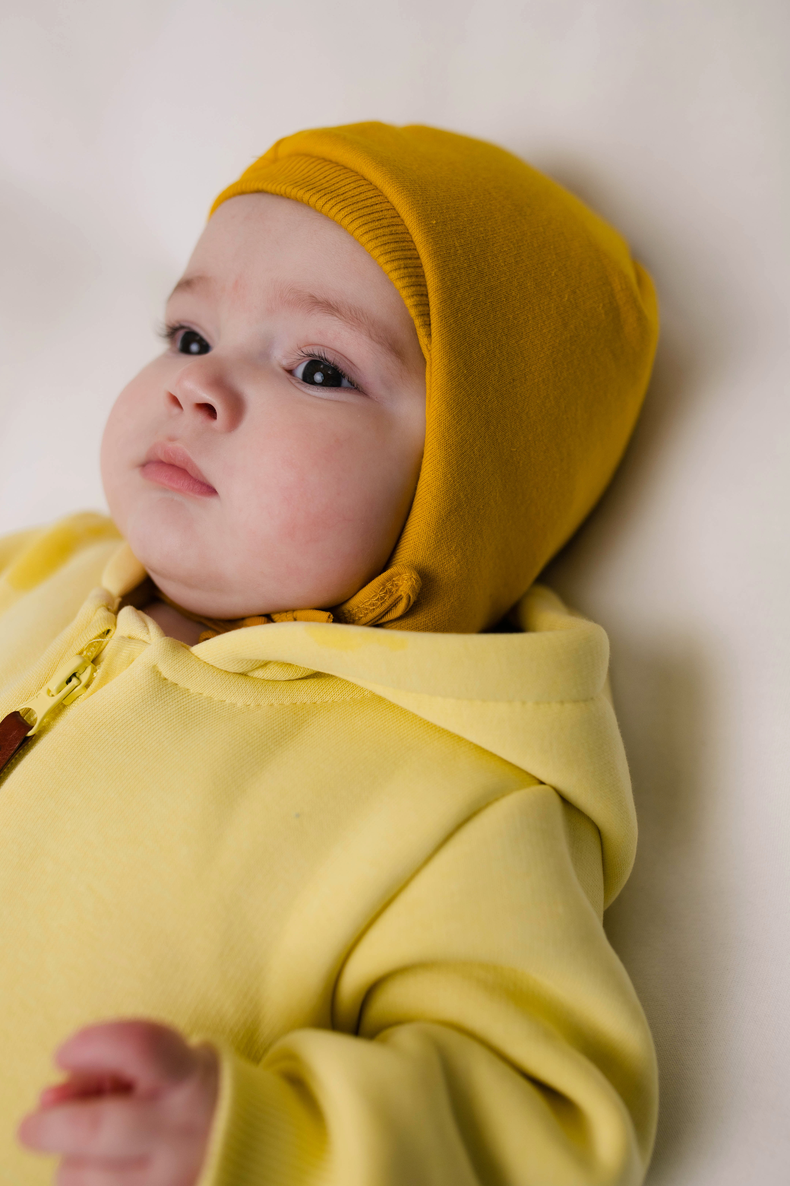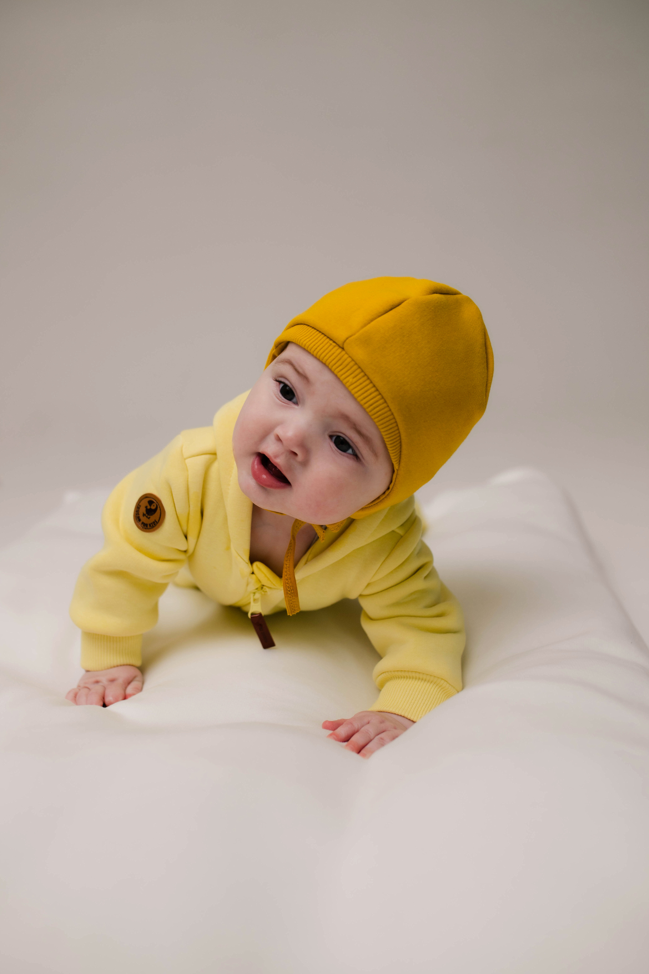 Шапочка из футера утеплённая с начёсом и хлопковым подкладом отлично защитит ушки малыша от ветра.