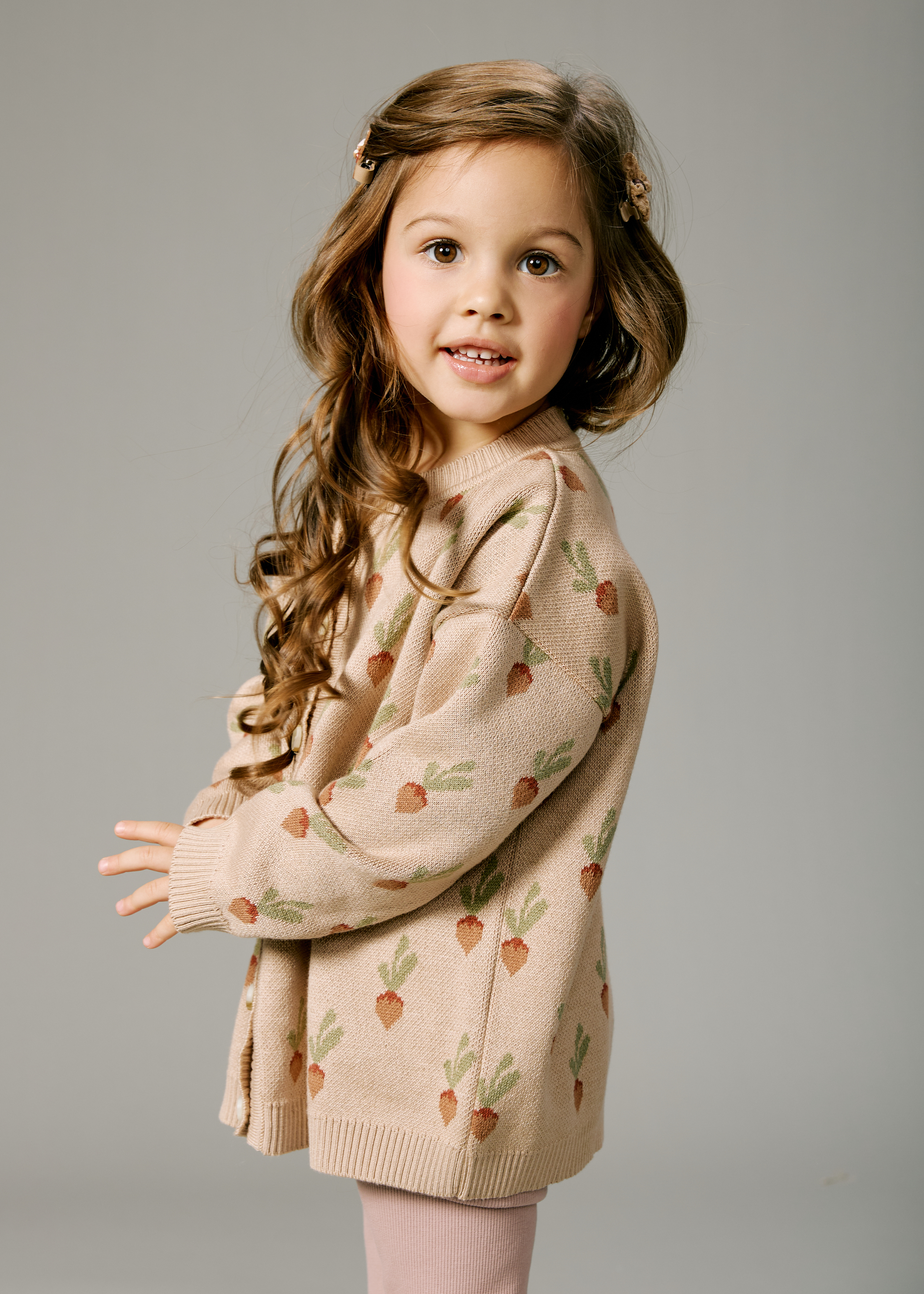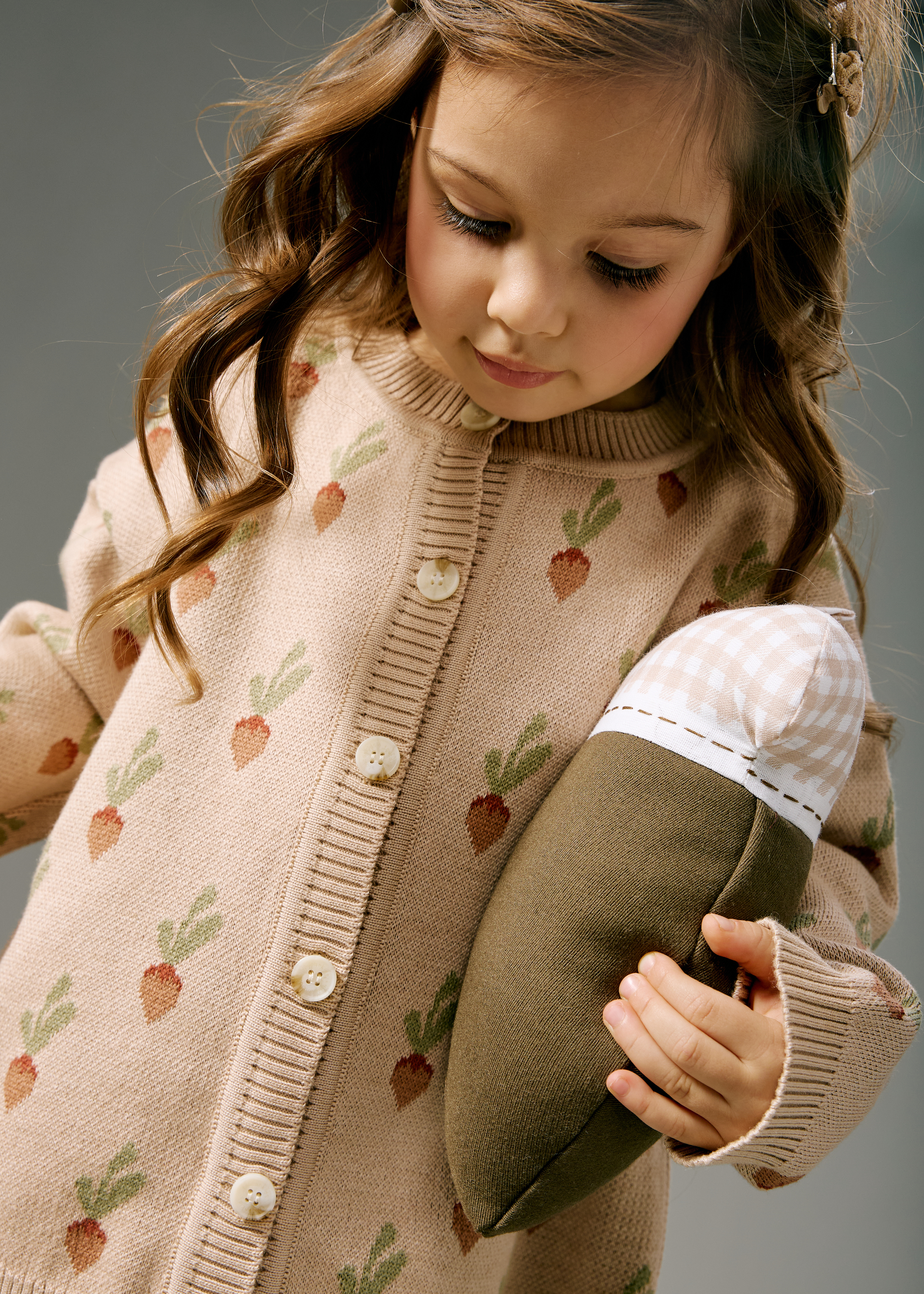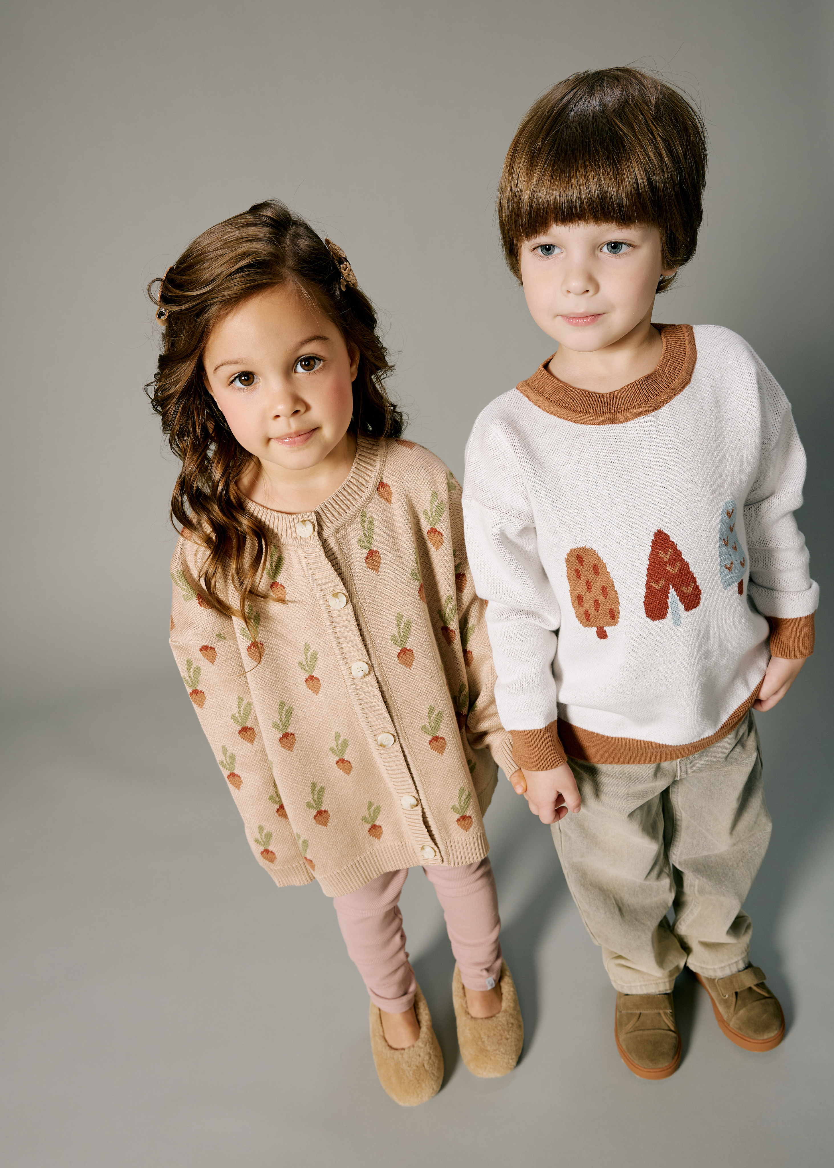 Аккуратный принт добавляет настроения и делает образ по-детски забавным.