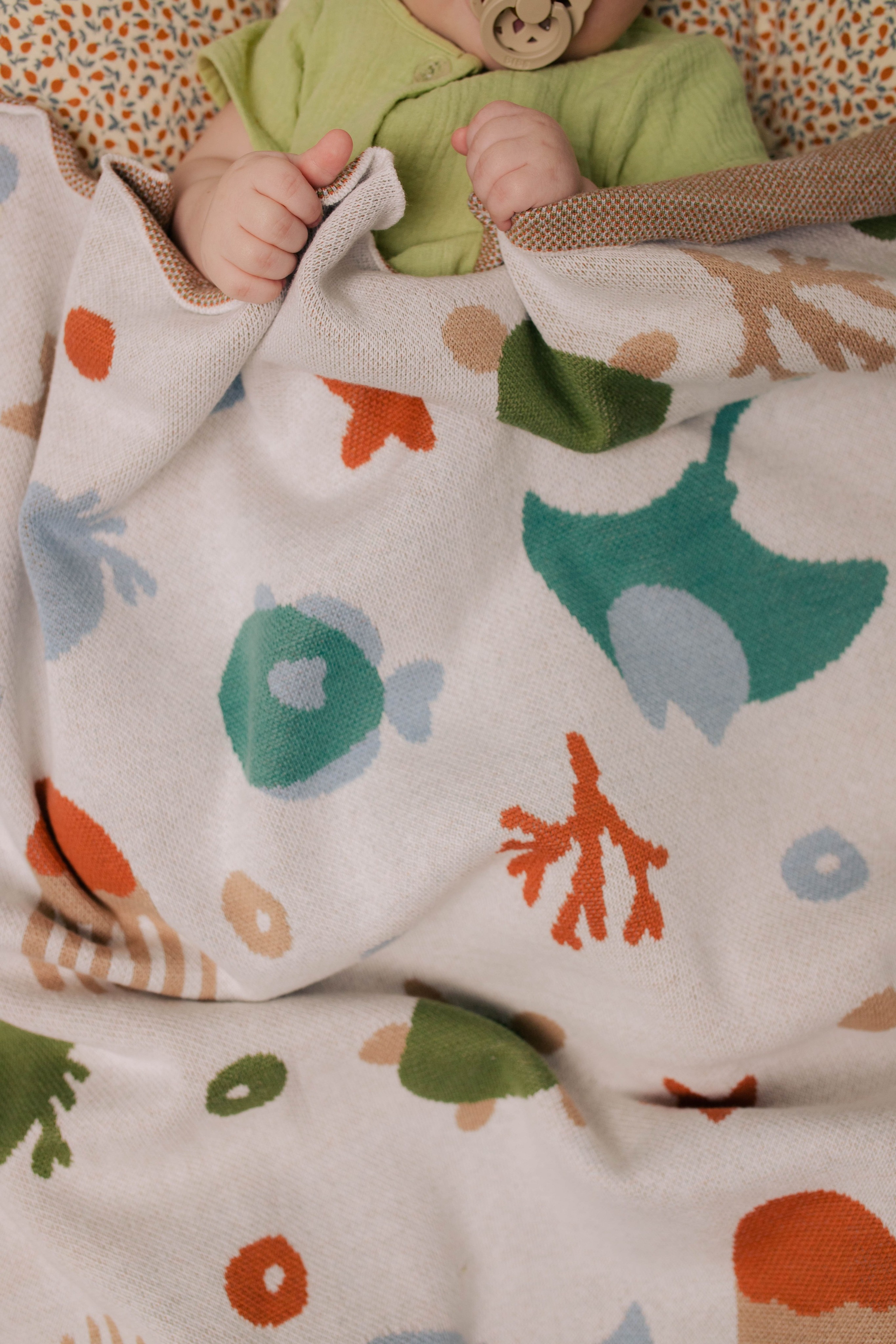 Вязаный хлопковый плед понравится вашему малышу своей мягкостью и милым рисунком. Он совсем не колется, не раздражает детскую кожу и легко сделает сон в кроватке или коляске уютнее.