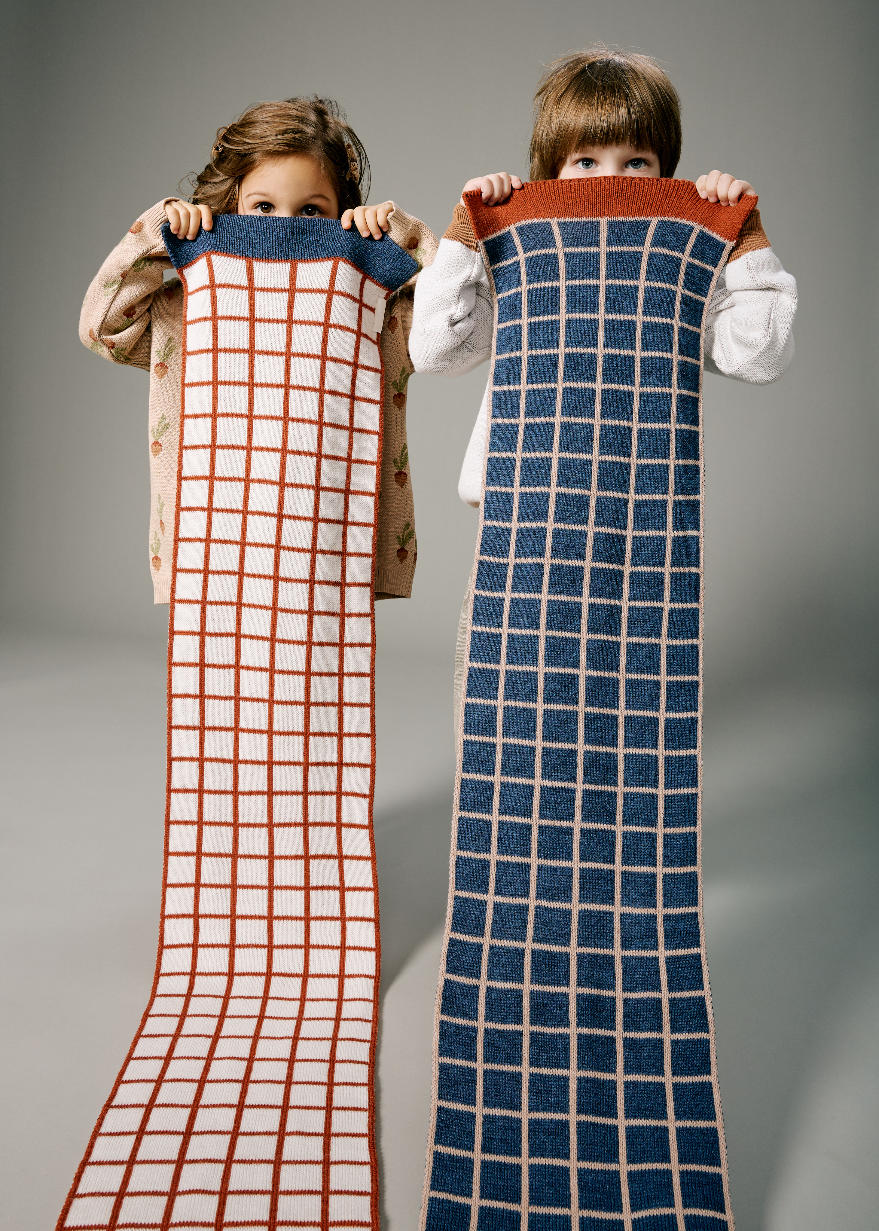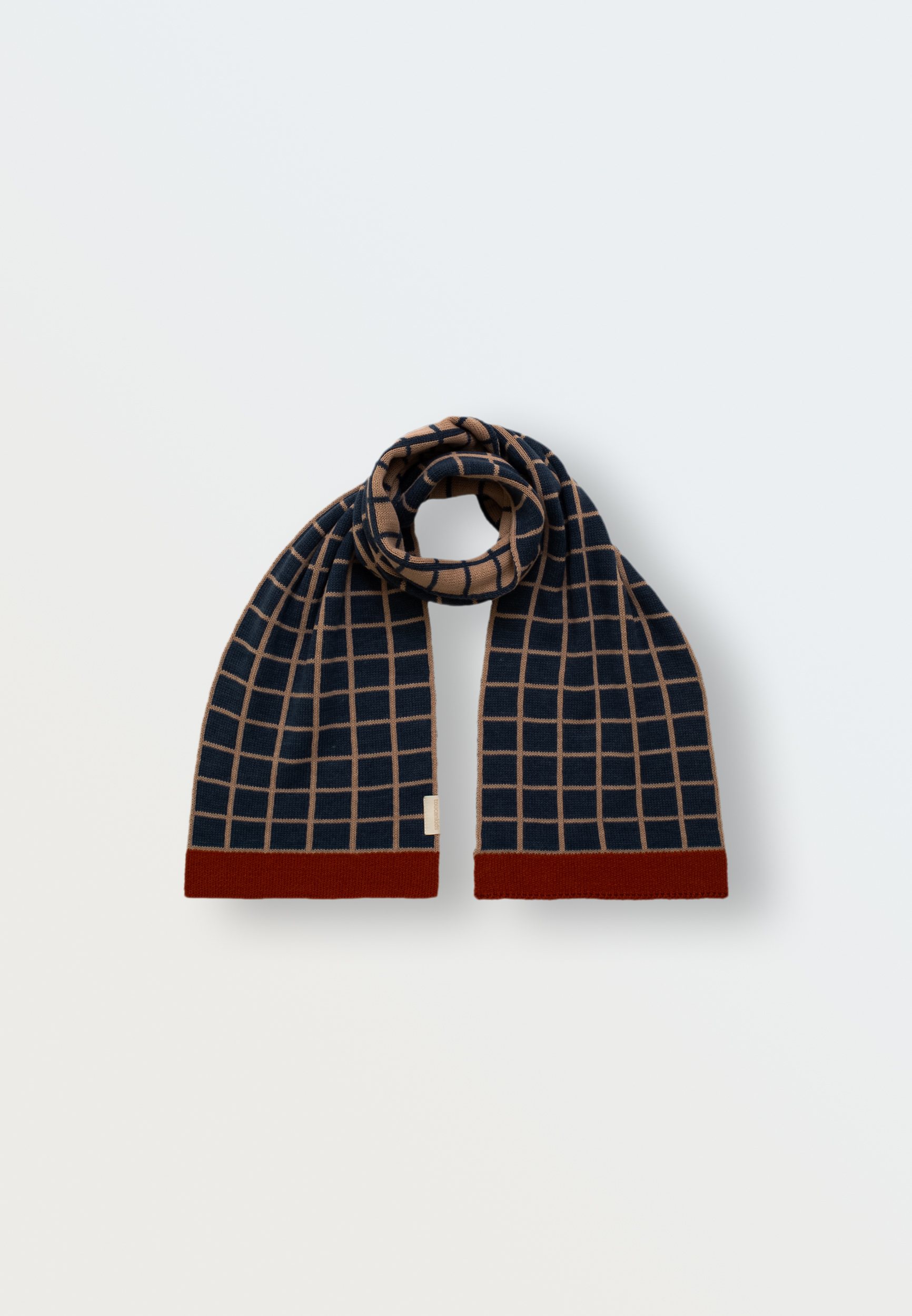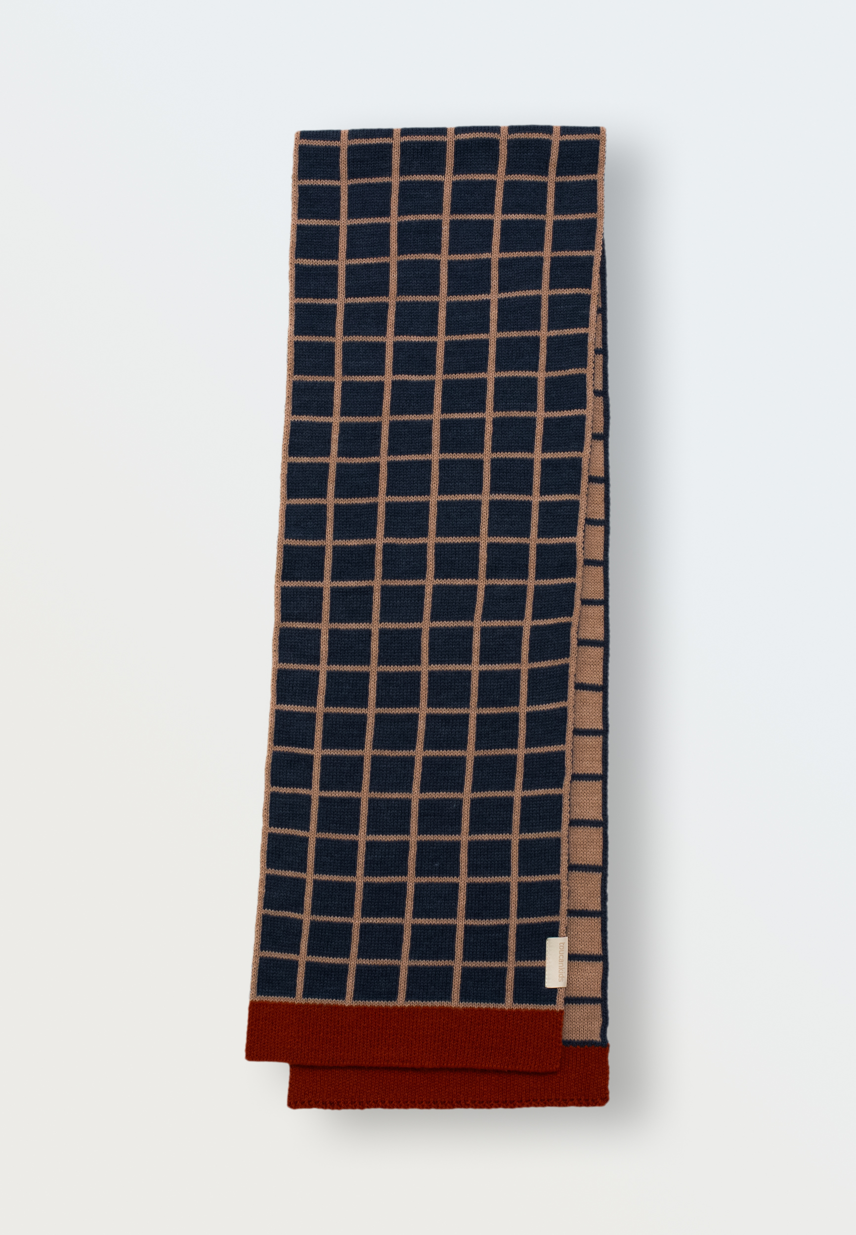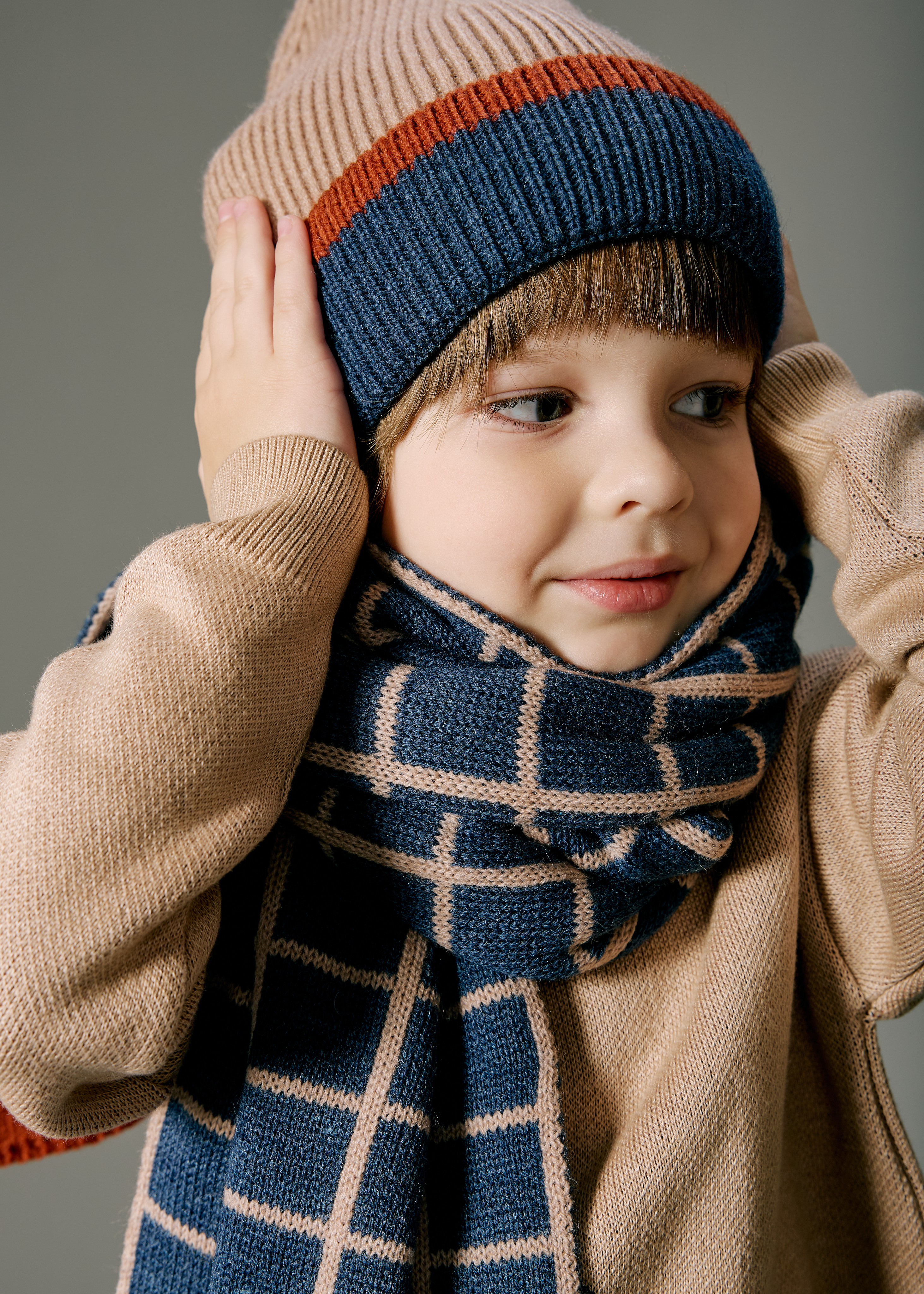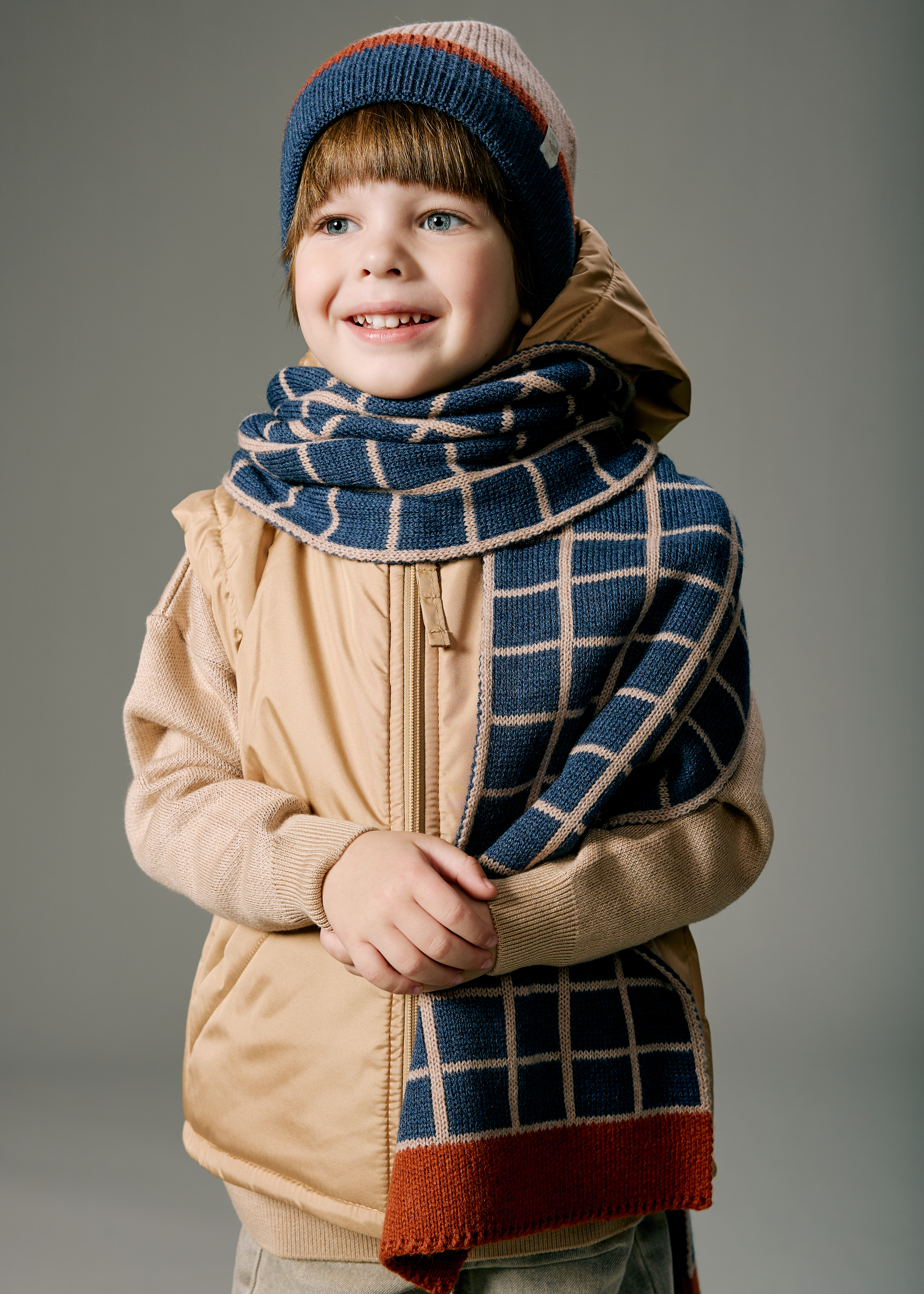 - Шарф вязаный "Клетка" (теплый беж + синий)
